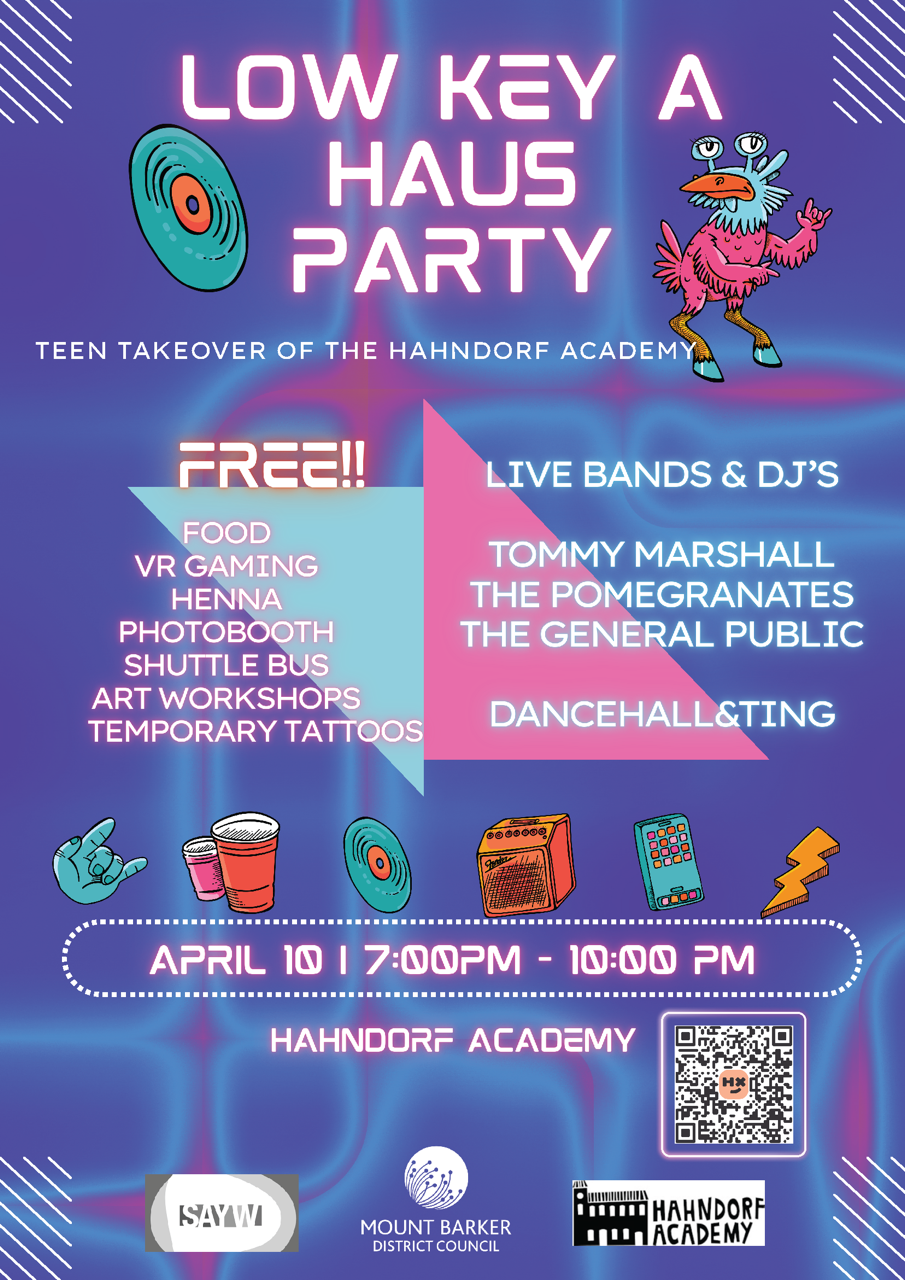 Commissioned by the District Council of Mount Barker, 'DJ Sqwauk' was a character design/mascot for a Youth Week takeover of the Hahndorf Academy by young people, for young people on the 10th of April 2026. Additional design elements were included on the poster design (pictured left) depicting items such as records, speakers, phones, solo cups etc.