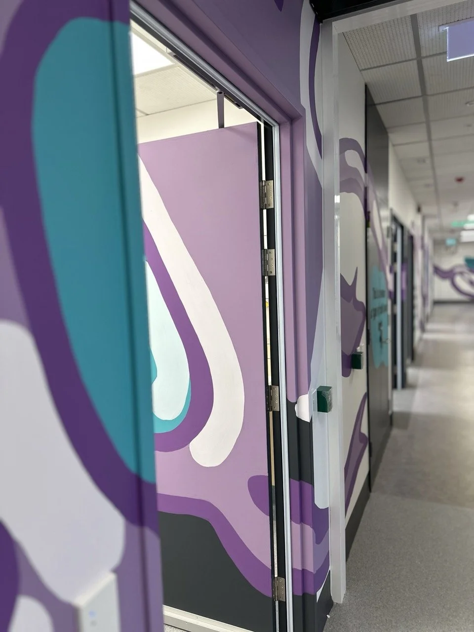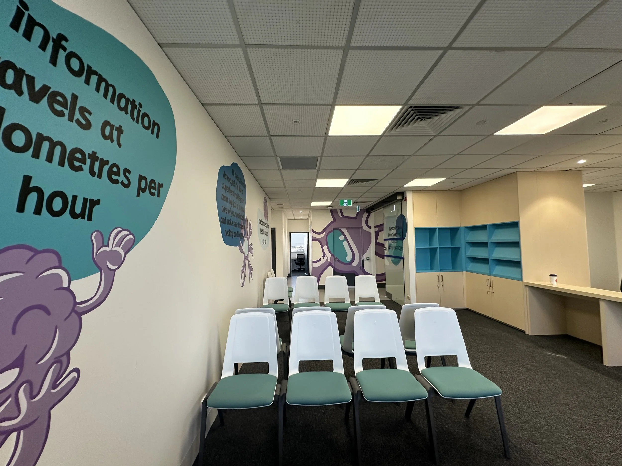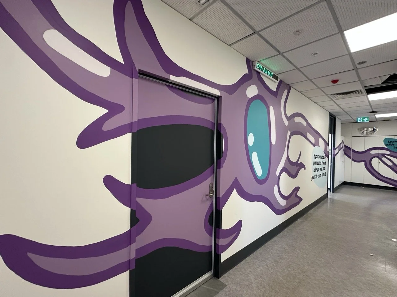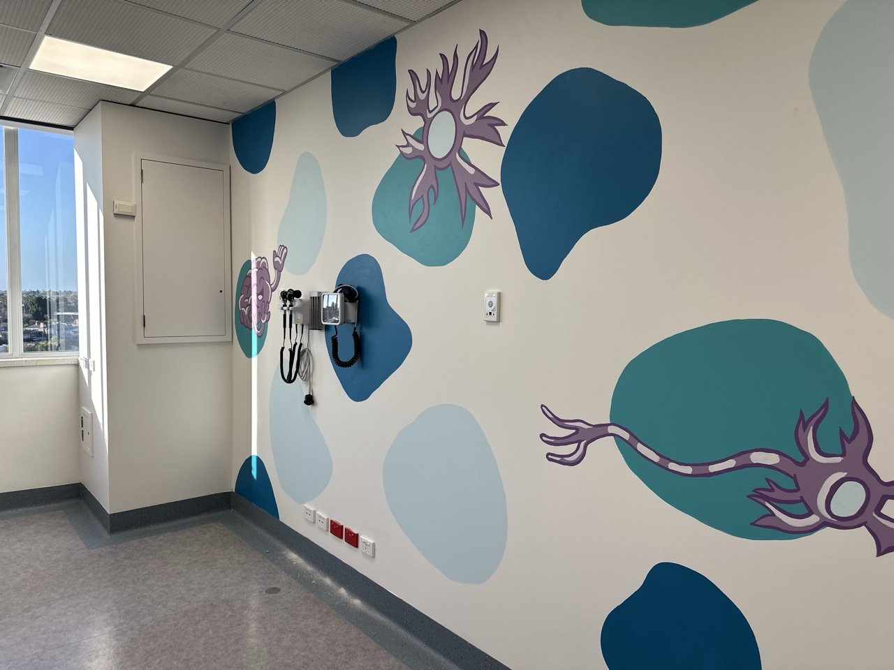 A mural commission at the Women's & Children's Hospital in Adelaide, South Australia. Commissioned in 2025 for their newly refurbished floor in the hospital. The project consisted of a mural wall for 4 EEG consult rooms, a waiting area mural, welcome sign and 17 metre long hallway mural depicting a neuron as well as a series of facts about the human brain.
